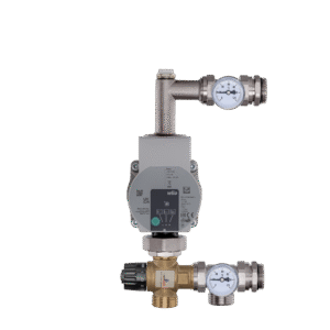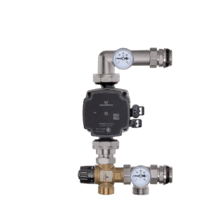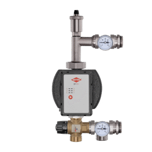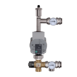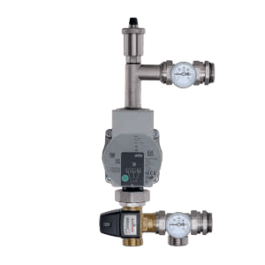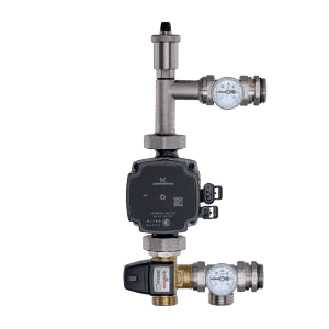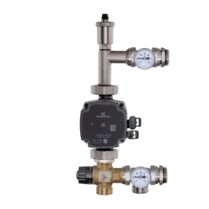 Месинговите смесителни комплекти (смесителни групи) се състоят от циркулационна помпа, трипътен клапан (биметален), термометри и вентилационен клапан.